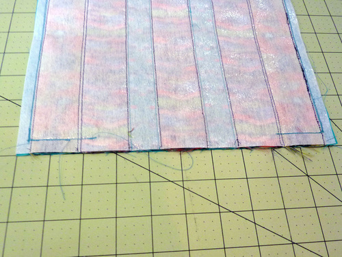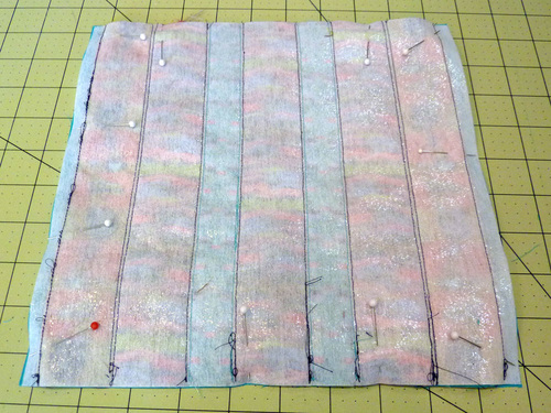 NOTE: Remember, as mentioned above, if you’d rather not use pins to hold your ribbons in place, you can keep them from shifting by applying a little basting glue or strips of lightweight fusible web to the wrong side of the ribbon lengths. - Here’s what all those parallel edgestitching lines look like from the fusing side of the interfacing.