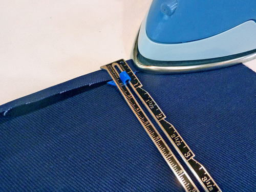 - Find one of the two 13″ x 9″ denim exterior panels.
