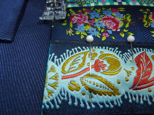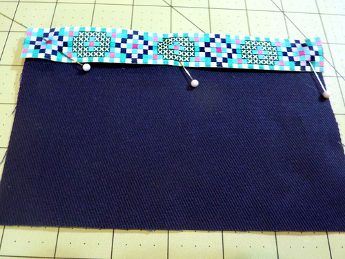NOTE: The thickness of the denim does not require a lining panel, but we still wanted a clean folded edge top and bottom. By folding the fabric to the front and hiding its raw edge with the ribbon, we create that clean folded edge along the top with just one layer of fabric. - Lay the ribbon across the pocket, hiding the raw edge underneath the ribbon. The top edge of the ribbon should be flush with the top folded edge of the fabric. Pin in place.