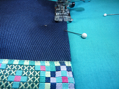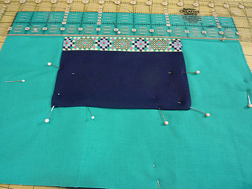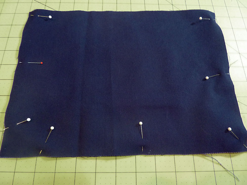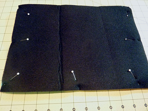 - Find the two exterior panels (one with the pocket, one plain). Place the two panels right sides together, sandwiching the pocket between the layers. Pin together along the sides and across the bottom. Along both sides, start the pins 2½” from the upper edge.
