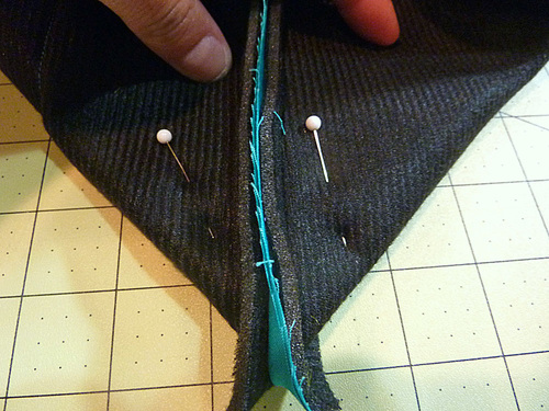 - Clip the corners and turn the flap right side out through the top opening. Push out the corners so they are nice and square. A long, blunt tool works great for this, such as a knitting needle, chopstick or point turner. Fold in the raw edges of the top opening so they are flush with the sewn seam and pin closed along the opening.