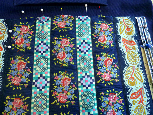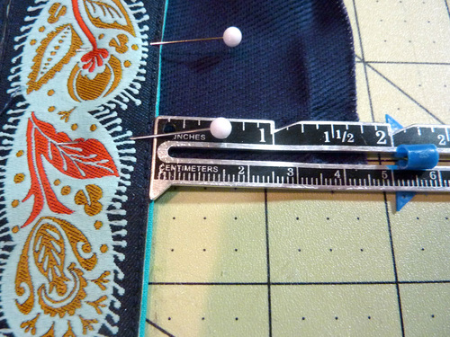 You’ll notice we used pins to hold our ribbons in place. Another option would be to apply a little basting glue or strips of lightweight fusible web, such as Stitch Witchery, to the wrong side of the ribbon. Read and follow the manufacturer’s instructions and test to make sure the ribbon can be easily stitched without the adhesive gumming up the needle. Some adhesives are not meant to be sewn through.