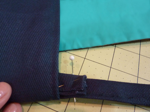 - Fold back the side and bottom raw edges of the pocket ¼” (this means you are folding back the raw ends of the ribbon accent), press well and then lightly pin to hold the folds in place.