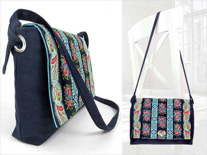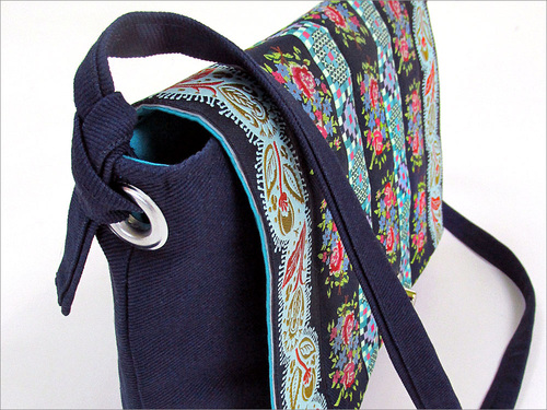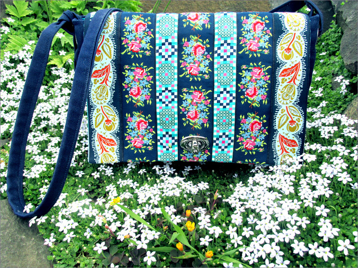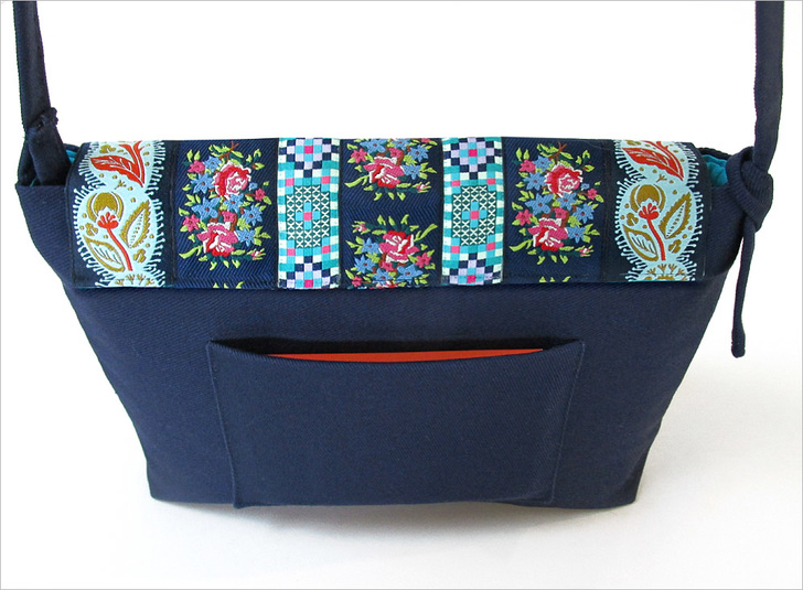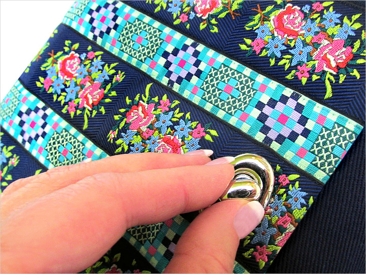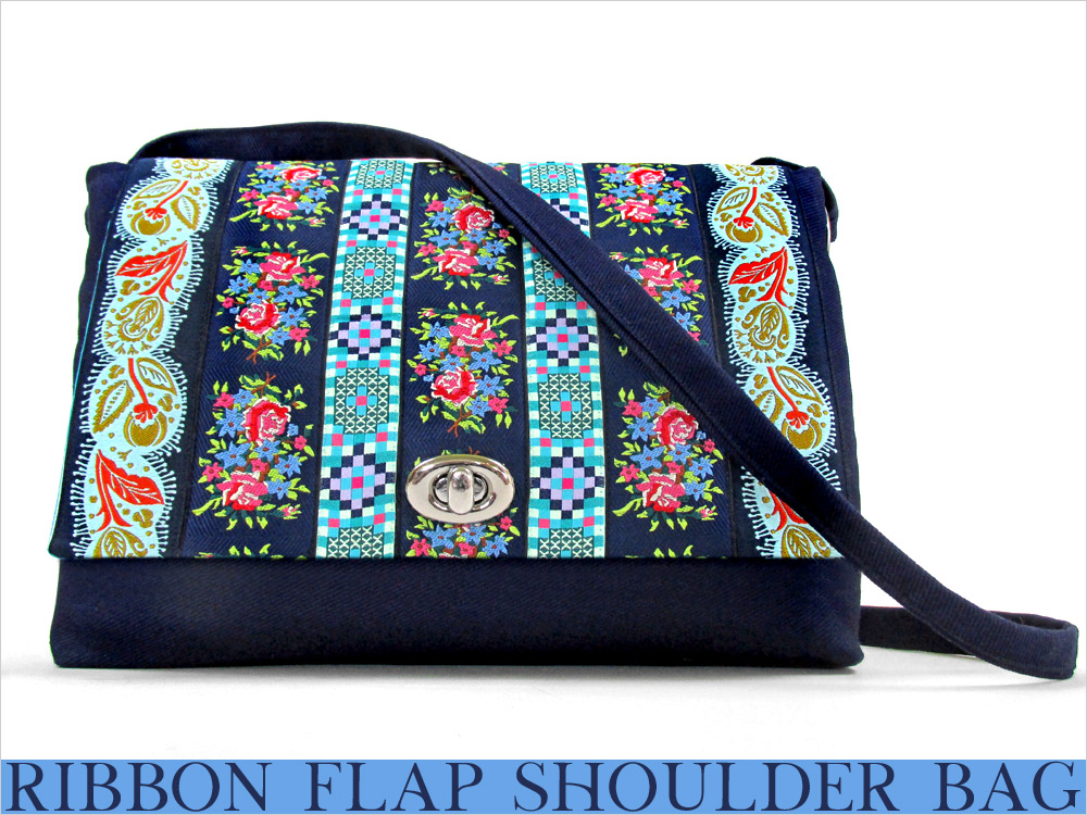 The beauty of ribbons always makes a statement. When paired with solid color fabric, they get others talking as well. This smaller shoulder bag features an attention-getting ribbon flap created from seven gorgeous Jacquard ribbons by Renaissance Ribbons. They are stitched side-by-side to the plain side of a layer of fusible interfacing. When the front and lining are assembled and pressed, it activates the fusing and creates a tight, smooth bond. True stability (and true beauty) with fewer layers. Read on to learn how to make your own statement.