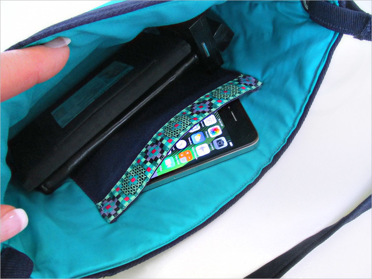 - Place the top of the ribbon flap (the top is the edge with the pinned opening) right side up across the back of the bag. The top edge of the flap should be 2″ down from the top raw edge of the exterior bag, which is also approximately 1″ above the top of the pocket.