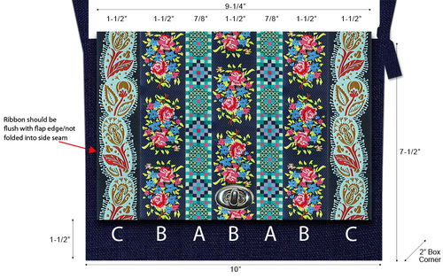 NOTE: We used THREE beautiful jacquard ribbons from Renaissance Ribbons in differing widths. These are referred to throughout as ribbons A, B, and C. Ribbon A refers to the two lengths of ⅞” ribbon near the center of the flap. Ribbon B is the trio of 1½” ribbons across the front. Ribbon C refers to the two 1½” ribbons at the outer edges of the flap. The yardage shown below includes a bit extra to allow proper fussy cutting of the dominant motifs.
