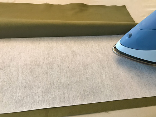 - Center the interfacing on one half of the pocket panel. The top edge of the interfacing should be flush with the pocket panel’s crease line. There should be ½” of fabric showing beyond the interfacing on the sides and along the bottom. Following manufacturer’s instructions, fuse the interfacing in place.