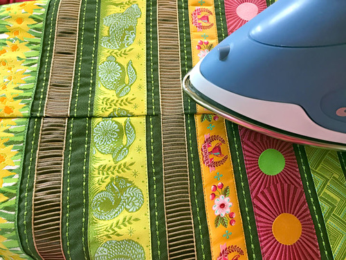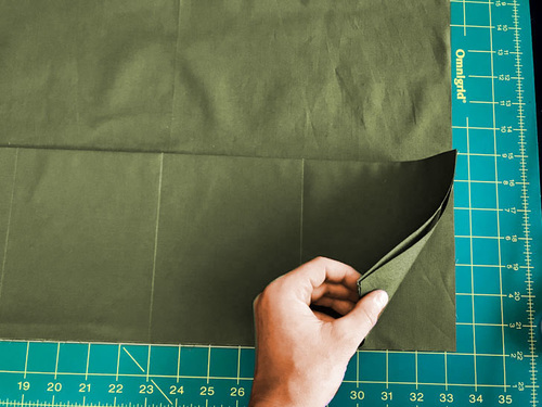 - Find the 32½“ x 13” pocket panel. Fold it in half, wrong sides together, so it is now 32½” x 6½”. Press to set a crease line.