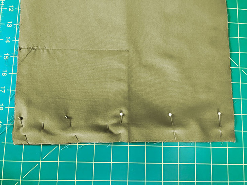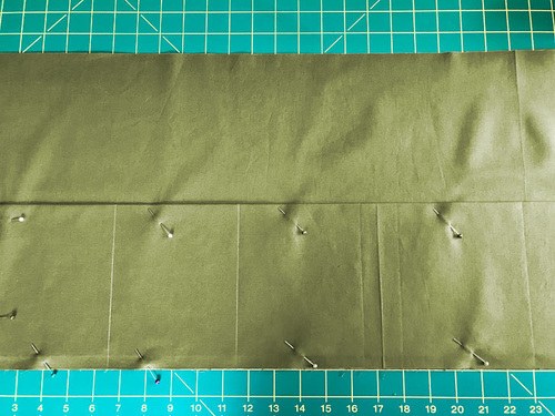- Fold the lining/pocket panel in half, right sides together, aligning the 13” raw edges. Pin in place.