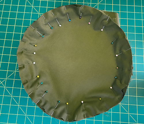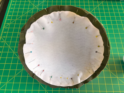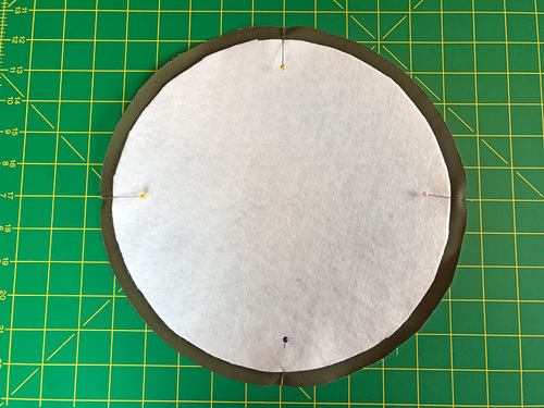 - Turn the exterior tube wrong side out. Set the base into the exterior tube so the two pieces are right sides together. Align the four “clock face” pin points of the base to the matching points on the tube. Pin together at these points first, then fill in around the base.