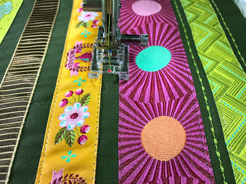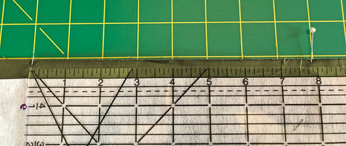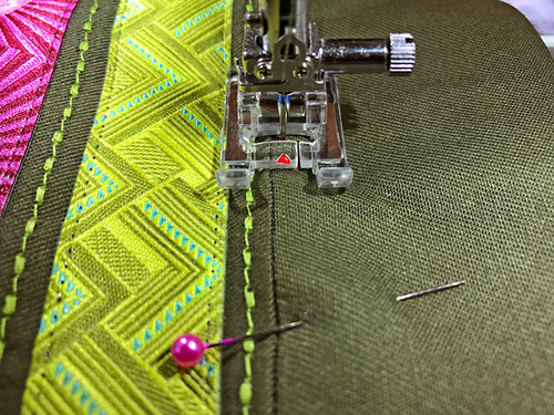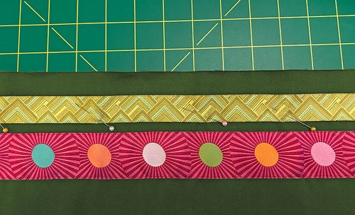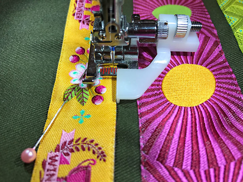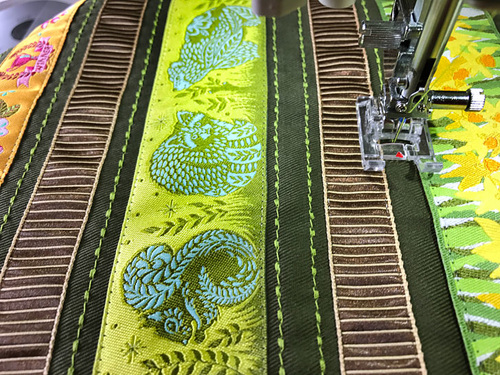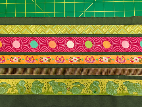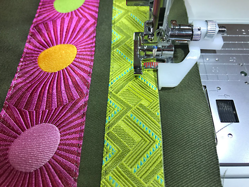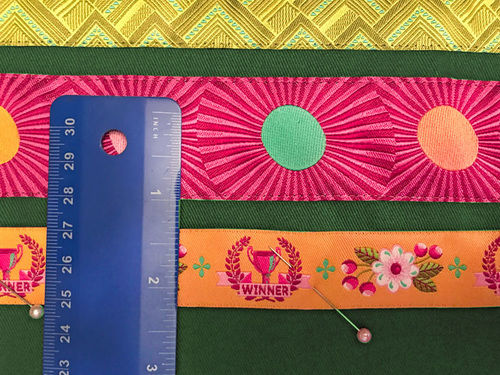 - Place the first ribbon (Mighty Corners in Green) into position 5/16” above the stitched-down ribbon. Again, make sure the new ribbon is parallel across the entire width of the panel. Pin in place.