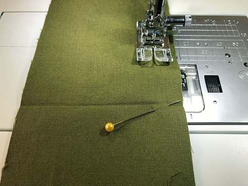 - Stitch vertically through all the layers, securing the overlap and creating two open channels to either side of the center seam.