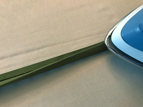 - On the 50” drawcord strip fold back each 50” raw edge ¼” and press well. Fold in half, wrong sides together, so the 50” folded edges are flush. Both ends of this strip remain raw.