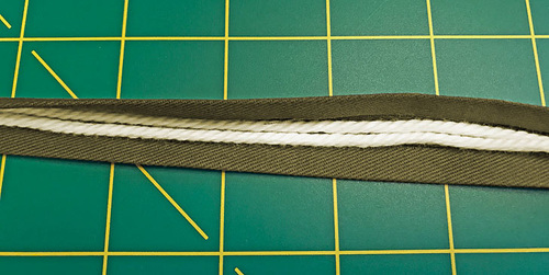 - Cut two 50” lengths of piping cord. Open up the folded strip and place the lengths of cord, one on top of the other, down the center. As mentioned, this will add some needed dimension to the drawcord.