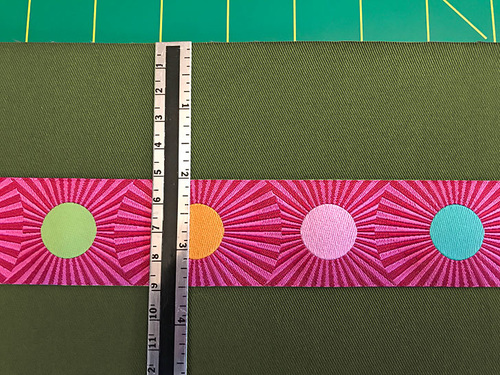 - We started with the second ribbon (Stripes and Dots in Pink) from the top because this ribbon sits exactly 2” down from the top raw edge. Pin the ribbon in place, placing the pins down the center of the ribbon and making sure the ribbon’s edge stays parallel with the top raw edge of the fabric across the entire width of the panel.
