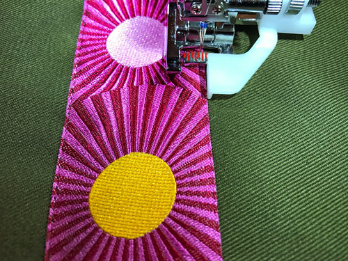 Because of the vibrant colors inherent in most ribbons, we prefer to stitch them in place with a clear monofilament thread in the top and bobbin for a nearly invisible finish. This is not mandatory, but it is a nicer look against the ribbon. For best results, you may need to loosen your upper tension slightly. It’s also a good idea to lengthen your stitch and sew at a slow and even pace. This type of thread does not stretch as well as regular thread and can break more easily under pressure, especially if it accidentally slides off the spool and wraps around the spool pin. Using a spool cap against the spool helps hold it in place on the pin, and again, going slowly and evenly helps the thread to feed correctly off the spool. Finally, always sew in the same direction along both sides of the ribbon. This will help prevent shifting and puckering. If you’d prefer not to use invisible thread, choose standard thread colors that very closely match your ribbon, and take the time to re-thread as often as needed to maintain a perfect match.