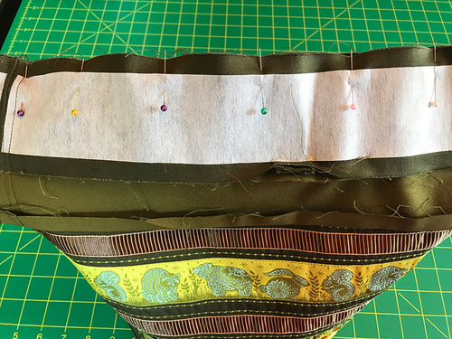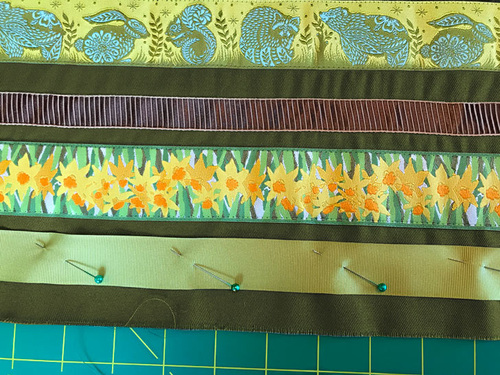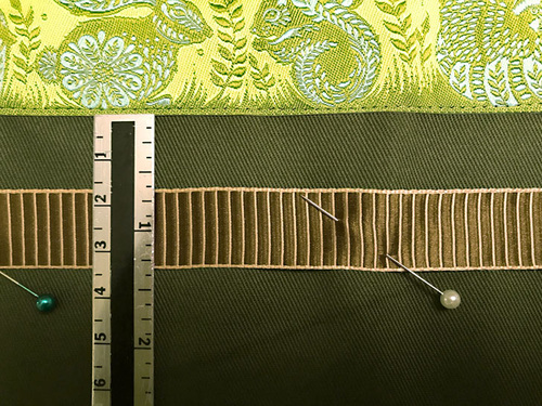 - Between the fifth and sixth ribbons, we used a ⅝” spacing. This is the band that will feature a double line of decorative stitching. Pin the sixth ribbon (Gold/Brown Reversible Satin Stripe) in place with this wider spacing.