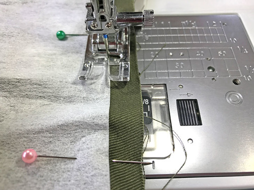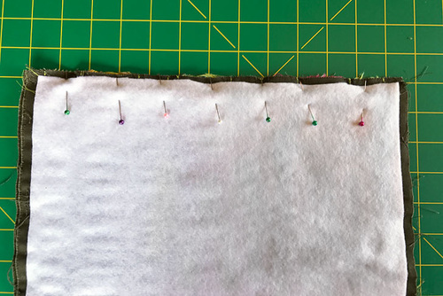 - Using a ½” seam allowance, stitch all around the top through all the layers. This means you are stitching along but not on the edge of the interfacing, giving you a handy guide line to follow.