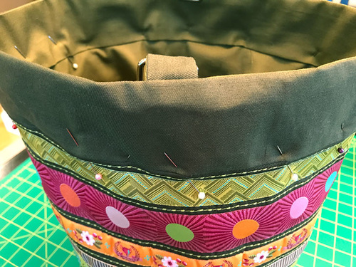 - Find the grommet panel loop and slip it over the top of the bag. The top raw edge of the grommet panel loop (the exterior side) should be flush with the top raw edges of the bag. Align the grommet loop’s seam with the bag’s center back seam. Pin in place all around through all the layers.