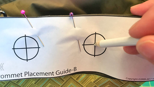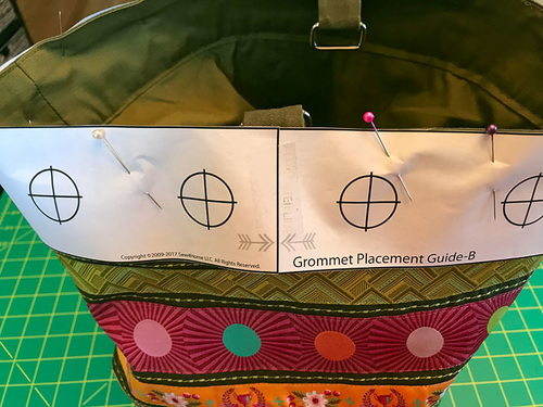 - Find the Grommet Placement Template. Place it in position around the top of the bag. The Template has guide lines for the center front and the back seam so it’s easy to align correctly. Pin the template in place.