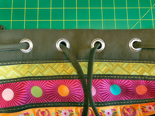 A ring of metal grommets allows the top of the bag to cinch closed with its own matching drawcord and DIY drawcord slider. Even though we did use a heavier exterior fabric, we still felt the drawcord needed a little more oomph. To add the proper dimension, we show you how to enclose two lengths of thin, soft cording.