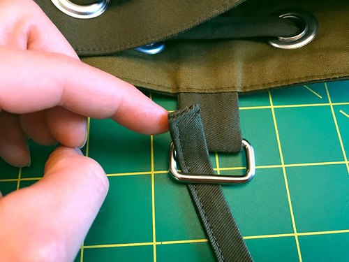 - Fold the lining half of the grommet loop down into position at the inside of the bag, which means you’re folding along the exterior/lining seam of the drawcord panel. The folded edge of the loop’s lining should cover the seam allowance evenly and neatly all around inside the bag. If need be, adjust the fold of the lining to create an even line.