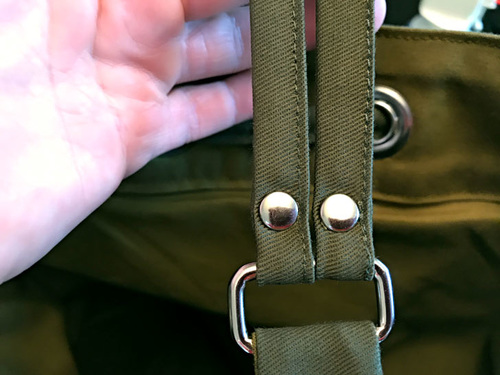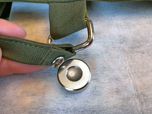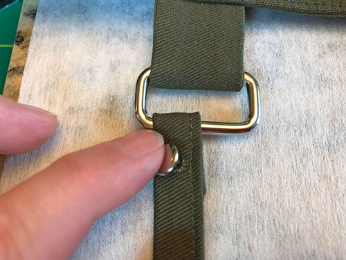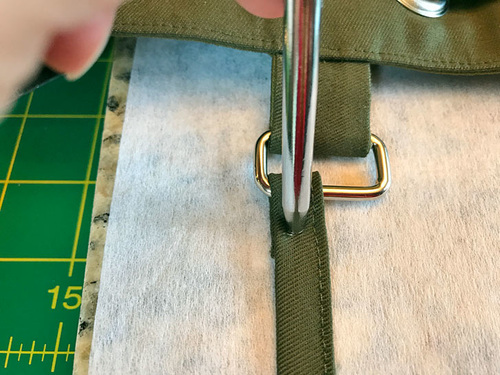 - Loop a strap through the ring, pulling it back on itself about ¾”. Make sure you are looping the strap through in the correct direction. You want the pulled-back end to be facing the inside of the bag. Pin in place.