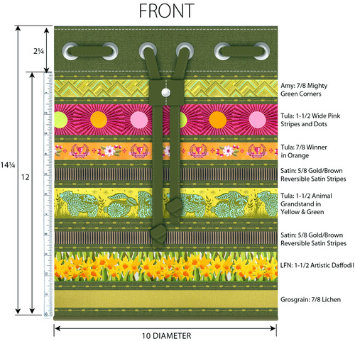 - SIX one-yard lengths of coordinating ribbon and ONE two-yard length of a seventh coordinating ribbon; you have 12” in finished height with which to work. We recommend varying your ribbon widths for the most interesting look. When calculating, don’t forget to leave room for the decorative stitch accents between the ribbon bands. We originally used the following ribbons from Renaissance Ribbons – not all are always available and in-stock, but there are dozens of beautiful alternatives.