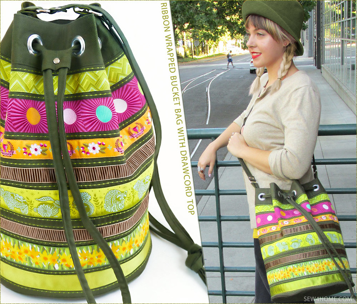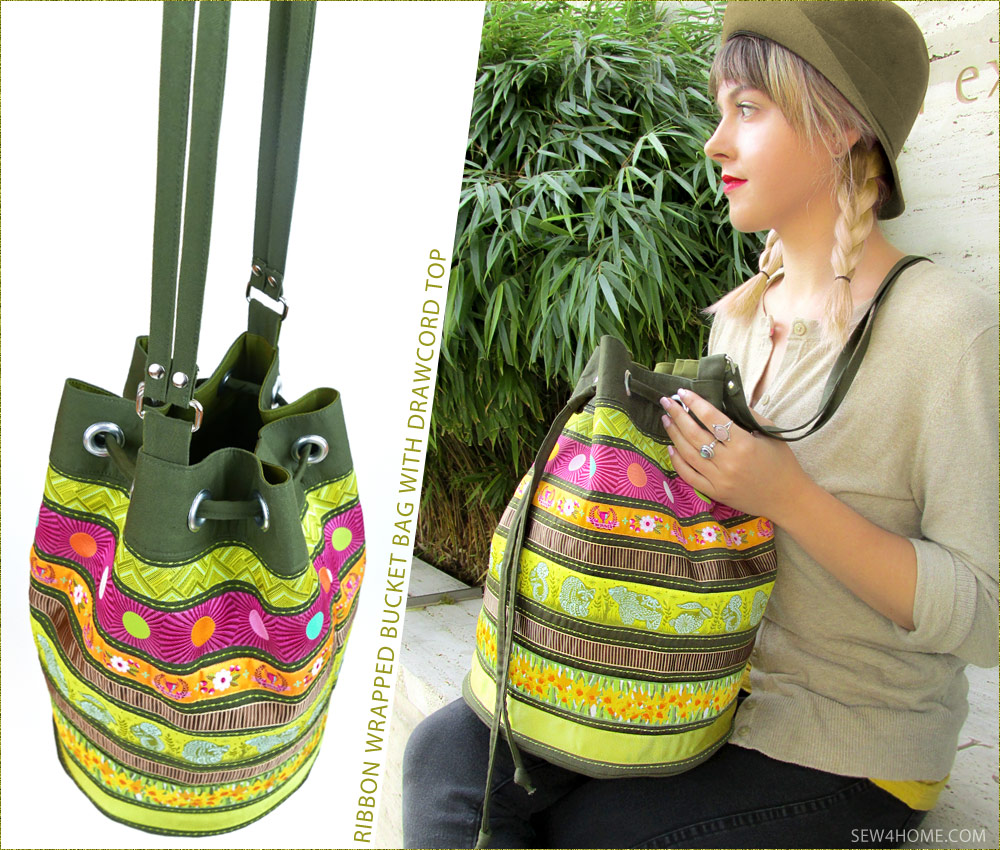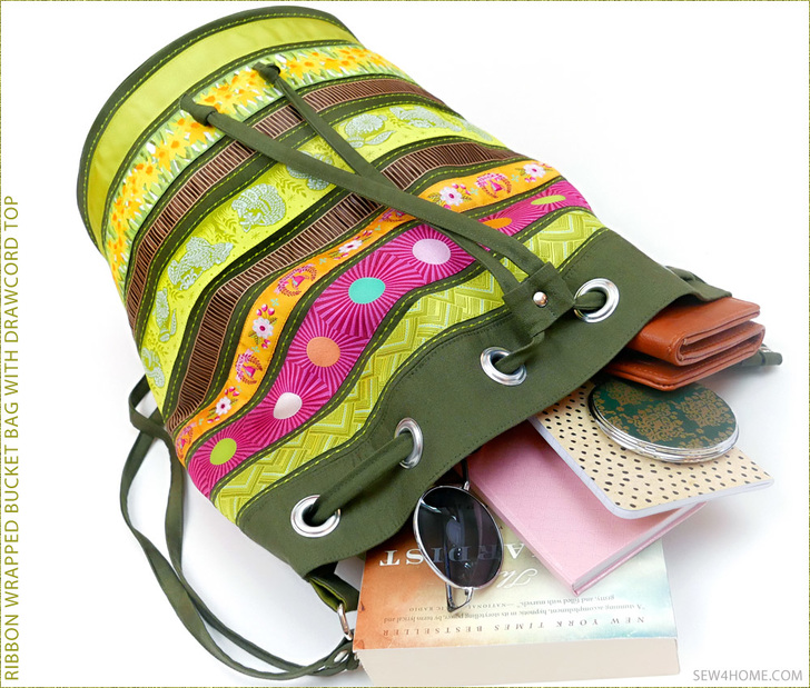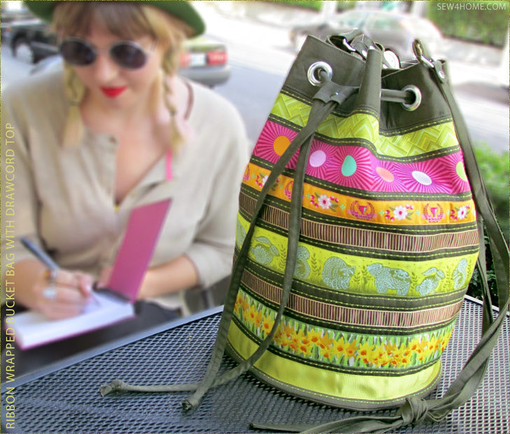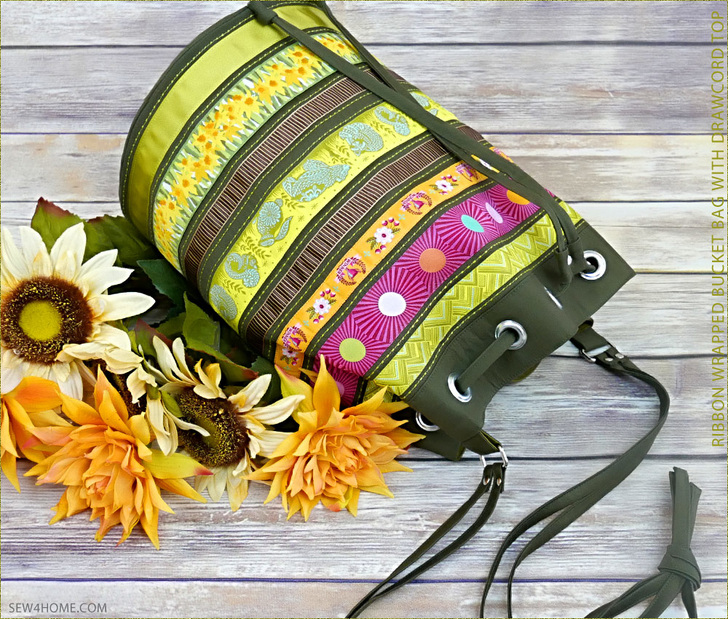 Simply. Stunning. Of course we love all our bags and totes here at Sew4Home, but every once in awhile, one of the designs turns out so fabulously, it becomes an instant all-star favorite. That’s the case with this Ribbon Wrapped Bucket Bag. If you’re a regular Sew4Home visitor, you know we are big fans of ribbon embellishment – especially Renaissance Ribbons. Their woven jacquard ribbons are the brightest, most beautiful ribbon we’ve ever found. Our tall drawcord duffle is the perfect project to showcase a merry-go-round of color.