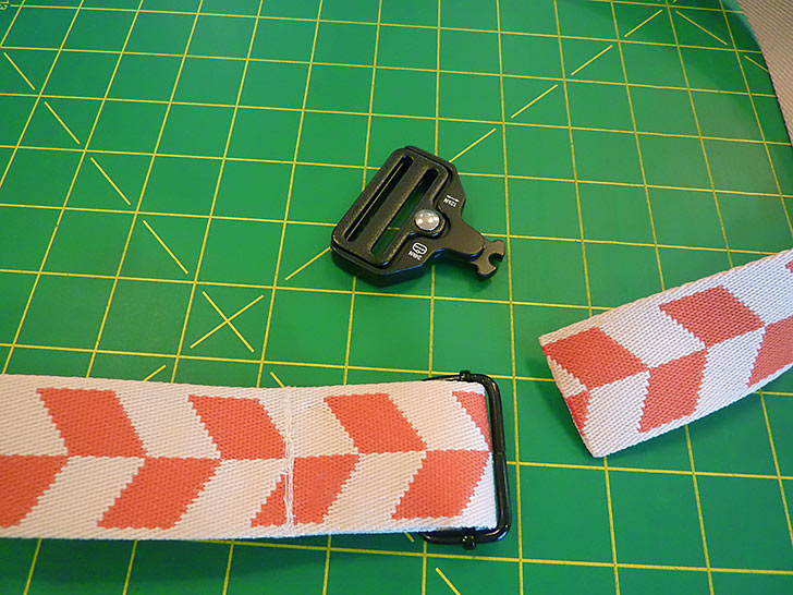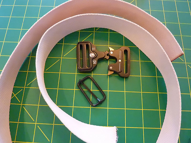- Collect all your elements: webbing, tactical buckle, adjustable slide buckle. One note about the tactical buckles we shopped for and finally settled on: in nearly all cases there was writing on the front of the buckles. This is correct. The easiest way to tell front from back is to look at the rivets: they will be smooth on the front, open on the back.