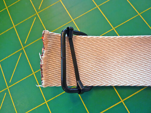 We recommend using a polyester webbing for a number of reasons: it’s weather-resistant, the cut ends can be sealed with heat from a flame so there’s no need for any hemming, and the colors and patterns available in polyester webbing are much more varied than cotton.