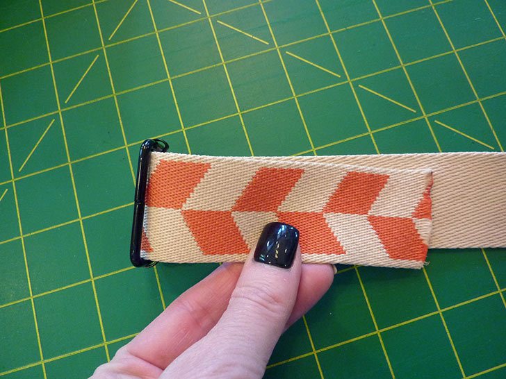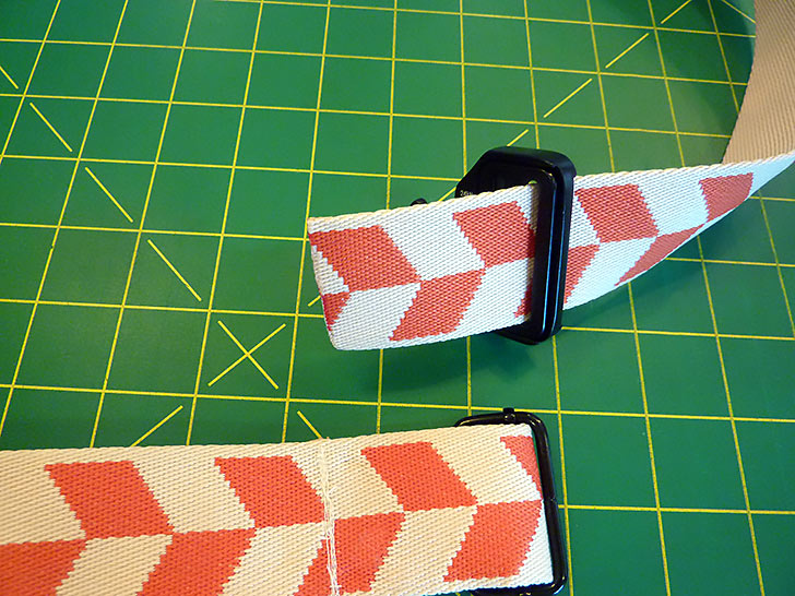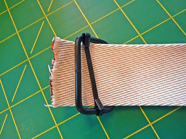 - Thread the raw end back through the slider. Go up and over the center bar, passing over the end you sewed in place around the adjustable slide buckle. The layers are one on top of the OTHER – wrong sides together.