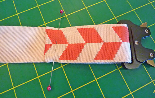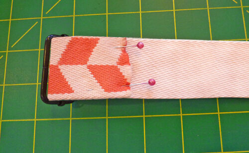 - As you did above with the adjustable slider, pull the raw end through so it is right side up against the back of the strap – the two layers wrong sides together. Pull through about 3”. This more generous pull-through is needed in order to have enough space for the finishing X Box. Pin in place.