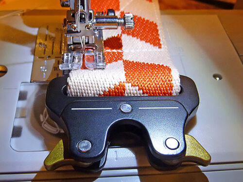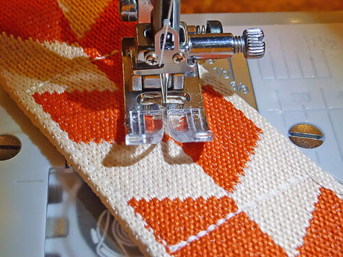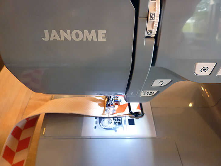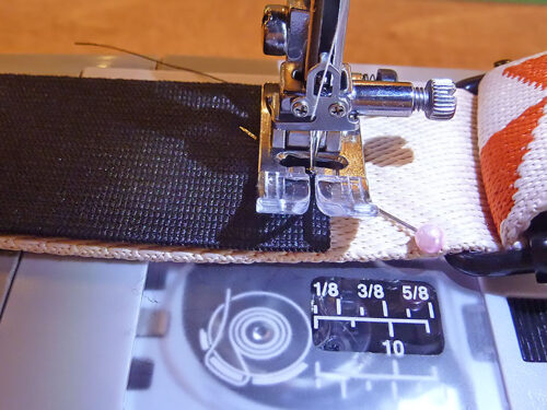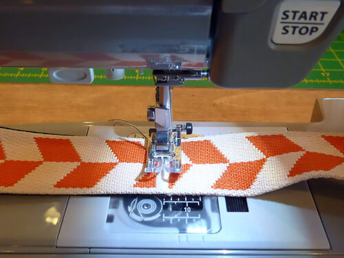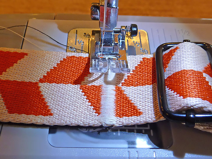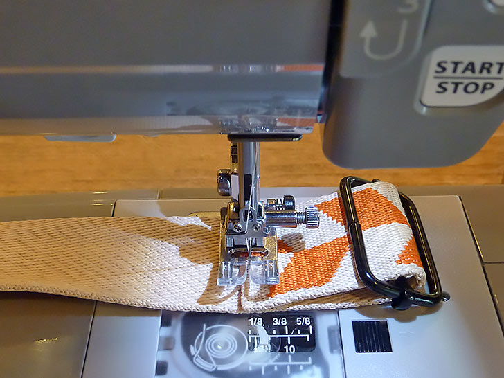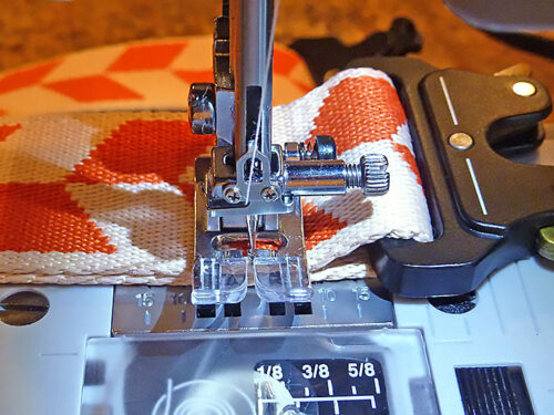 - The machine should be threaded with thread to best match your webbing in the top and bobbin. As mentioned above, we used a heavy thread. Slide the webbing layers under the presser foot, adjusting the position so your seam will fall about ⅛” in from the cut end.