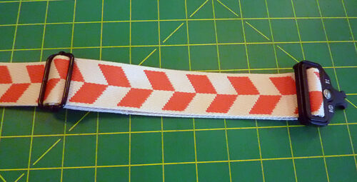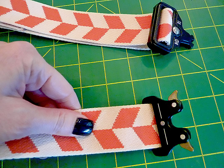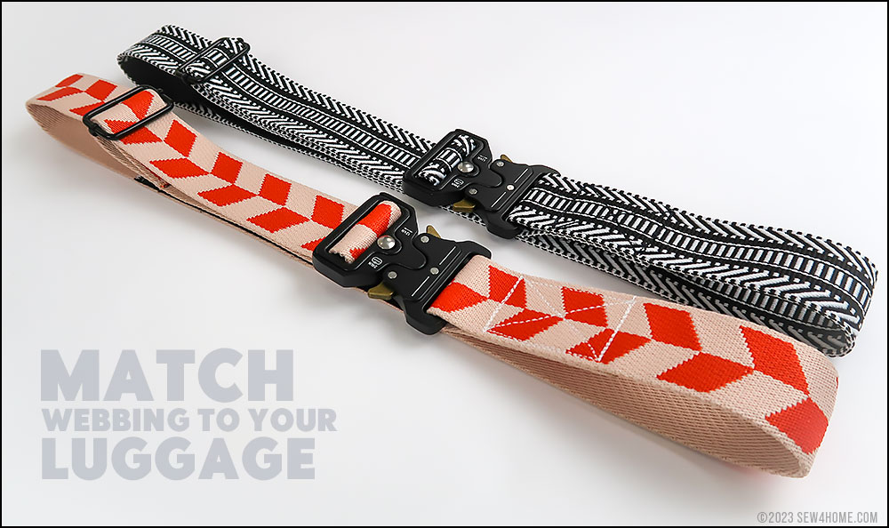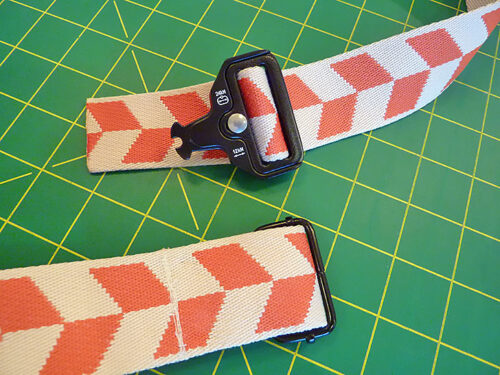 Our belt samples are both 1½” in width, which is an easy-to-find size for both webbing and hardware. Links are included below for our sources. The finished belts are fully adjustable from approximately 33“ to 40”. As described within the step-by-step instructions below, you can and should test the length on your own rolling case with the tote you wish to secure. You can then determine if you want your starting length to be shorter or longer.