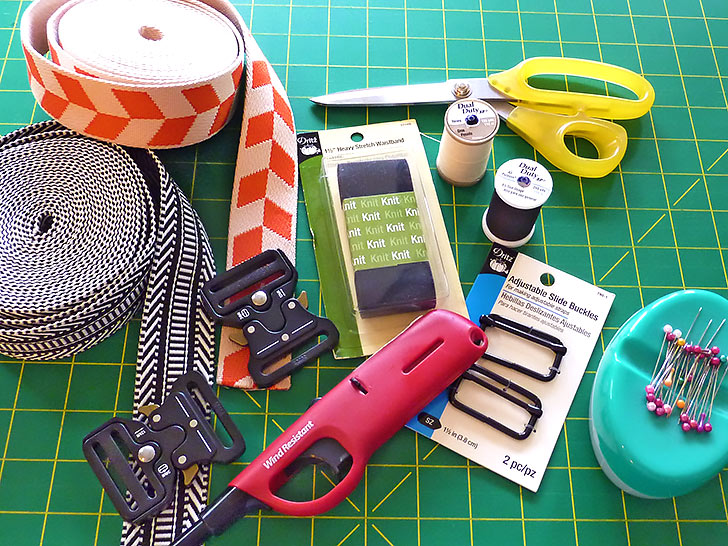 NOTE: As mentioned above, consider getting extra webbing to practice with if you are new to making an adjustable strap. In addition, we do strongly recommend polyester over cotton webbing. It will be weather-resistant, and it is easier to finish the raw ends by melting rather than with a hem. - No-roll, heavy elastic to match the width of your webbing; we used 1½” Dritz Heavy Stretch Waistband Elastic