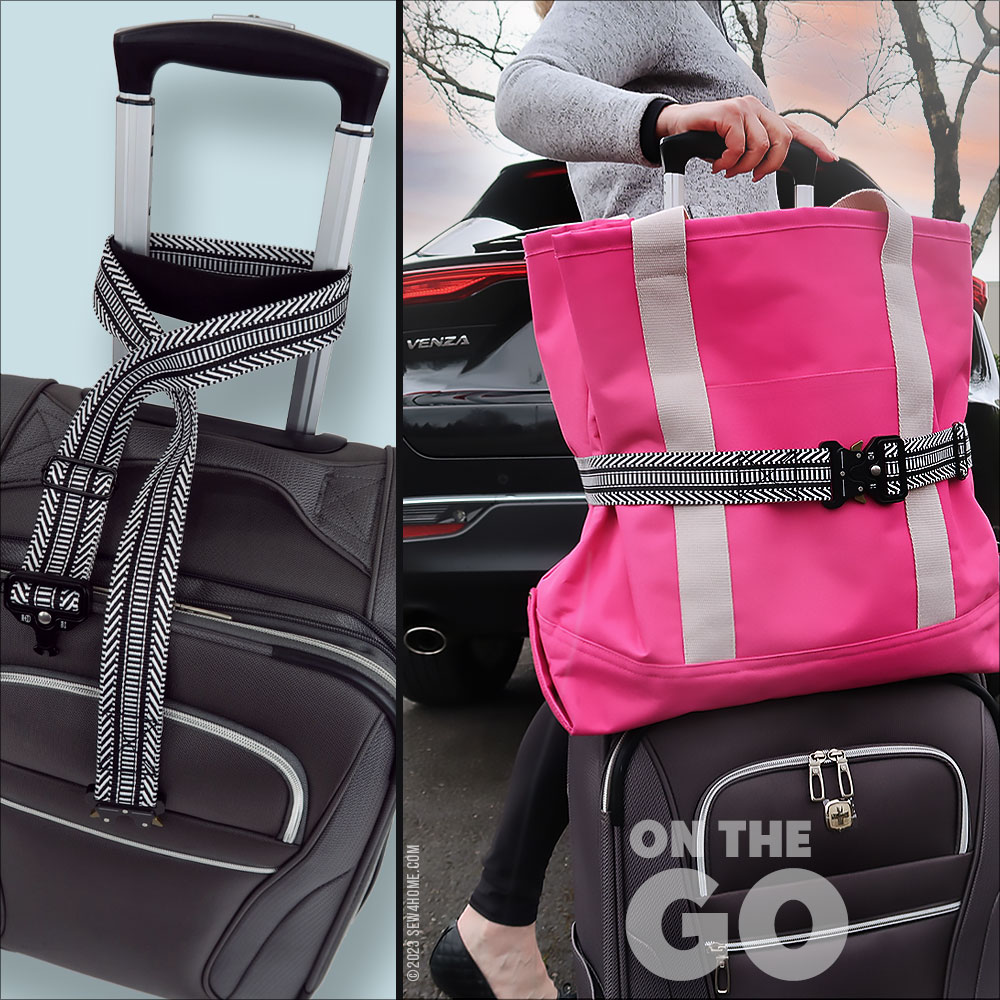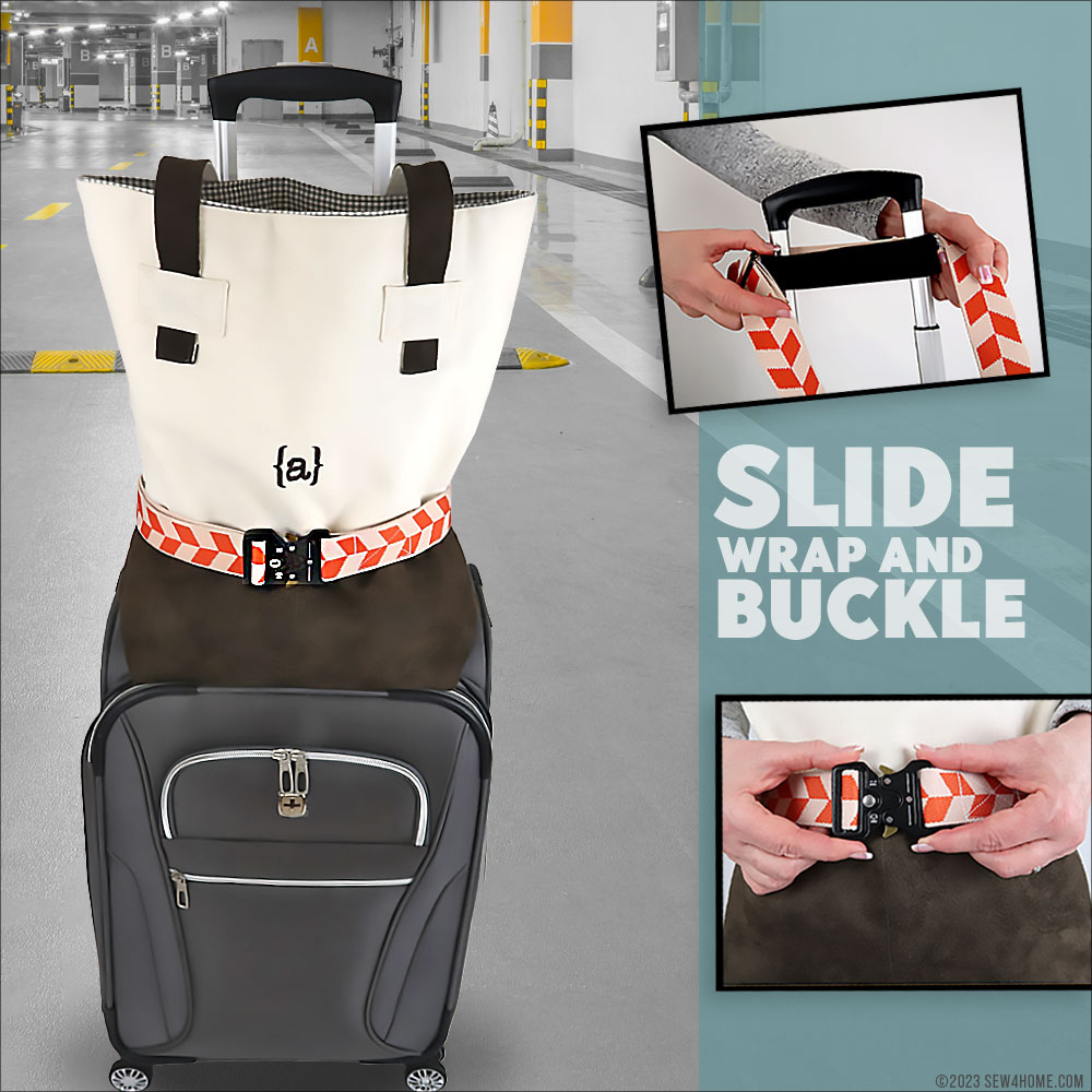 The belt is quite simple to make and very easy to use. Roll it up and stash it in your rolling case or tote. When you arrive at your destination, unfurl the belt. There’s a hidden elastic loop at the back. Slip the loop over the case’s extended handle. Set the tote on top of the case and wrap the belt around it, adjusting the fit as needed with the adjustable slide – it should be a snug cinch. Clip the buckle closed, and off you go. The tote stays put as you roll. No more worries about it toppling off or pulling over the case.