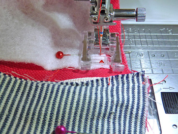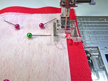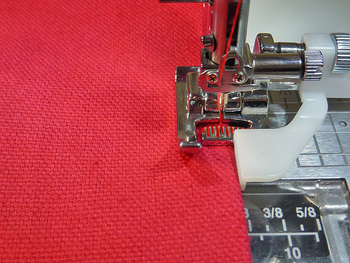 - Make sure the machine is threaded with thread to best match the exterior in top and bobbin. Lengthen the stitch slightly. We used the Janome Edge Guide foot to maintain a precise ⅛” seam allowance.