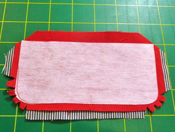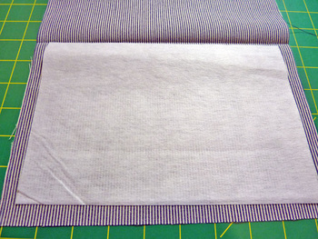 - Re-fold the pocket panel wrong sides together, sandwiching the interfacing between the layers. There is no additional pre-stitching on this part of the pocket; it is secured in place with the handle strapping.