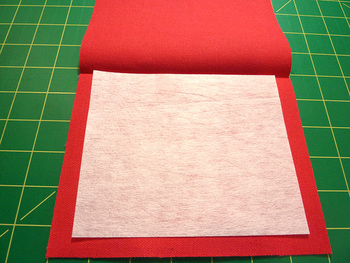 - Center the interfacing on the wrong side of the flap exterior so there is ½” of fabric showing beyond the interfacing all around. Following manufacturer’s instructions, fuse in place.
