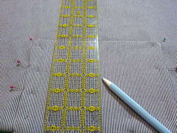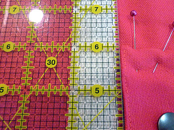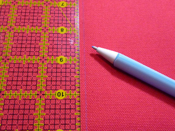- Along the bottom of the pocket, find the center point, which will be 3½” in from either raw side edge. Mark this center point with a pin. Then, measure 2¾” to the right of the center point and draw a vertical line from the bottom raw edge up 10½”.