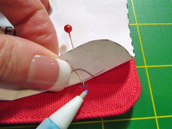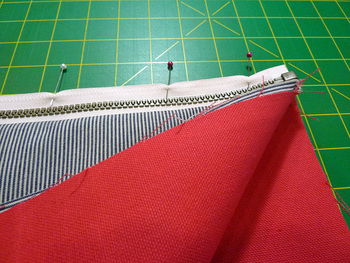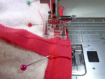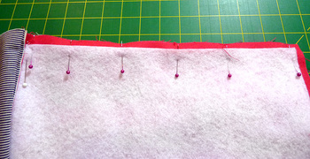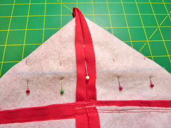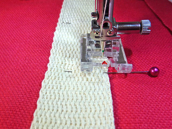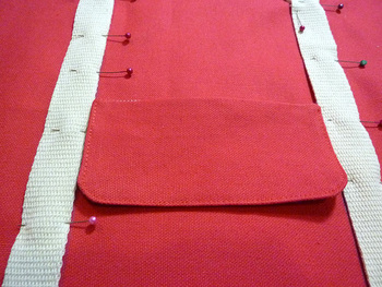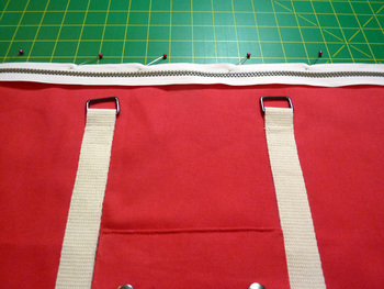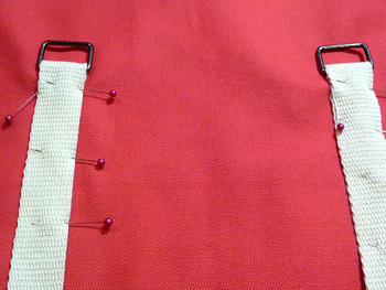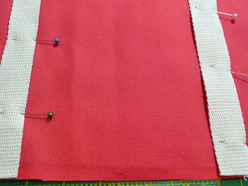 - Align the inner edge of each length of webbing along the drawn guide lines, overlapping and concealing the raw side edges of the pocket. Pin the webbing in place.