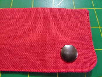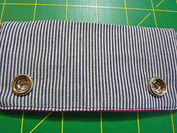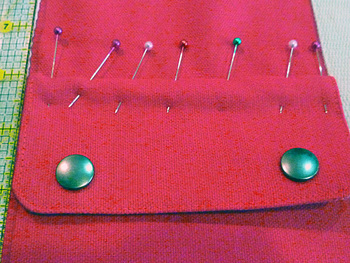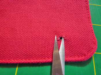 - Turn the flap right side out through the small top opening. Gently round out the button curves and push out the upper corners. A long, blunt tool works well for this, such as a knitting needle, chopstick or point turner. Press flat, pressing in the raw edges at the opening so they are flush with the sewn seam.