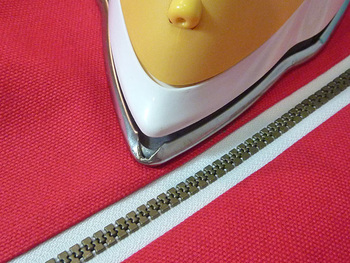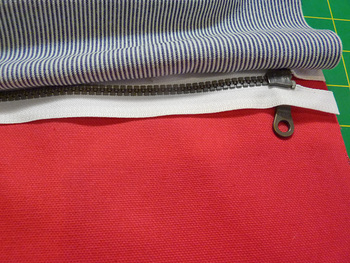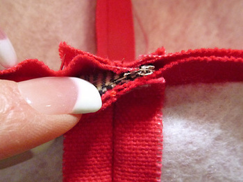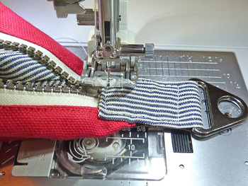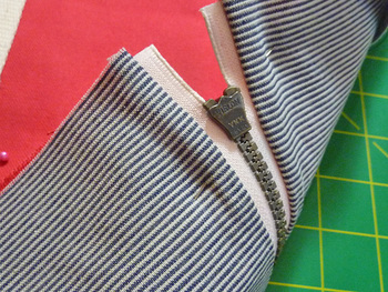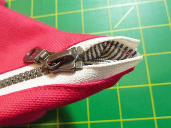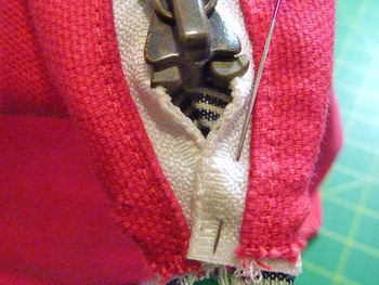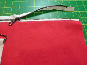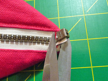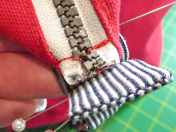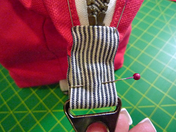 - Tidy up the end, then slip the tab into place just as you did on the head end of the zipper, and pin in place.