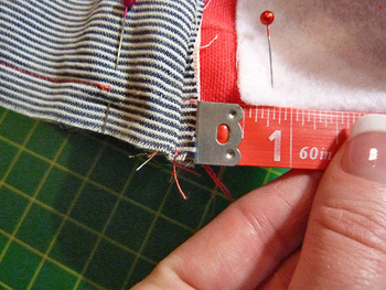 - Our finished boxed corner depth is 8”, which means you measure vertically from the corner point of your seam (the actual end point of the seam – not the tip of the fabric) down along the seam line, HALF the width of your finished corner – or 4″ in our sample. Draw a line at this point and pin along the line.