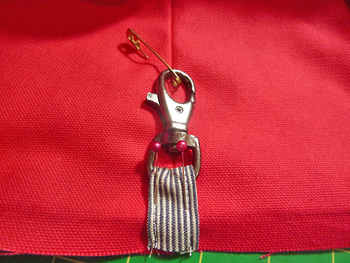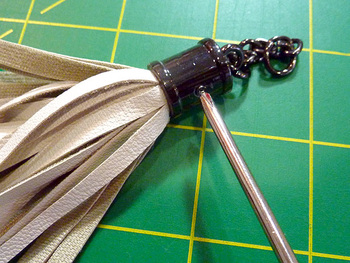 - The last link on the Tassel Cap chain is an open jump ring. To open it, rather than pulling the ends apart and stretching it out of shape, gently pull the two ends away from each other in a sideways motion. This is where having two pairs of pliers for griping, opening, and closing is helpful. Slip the jump ring over the ring of the Dritz ½” Swivel Hook, and gently squeeze close to finish. Clip the Swivel Hook onto on of the Rectangle Rings on the front of the duffle.