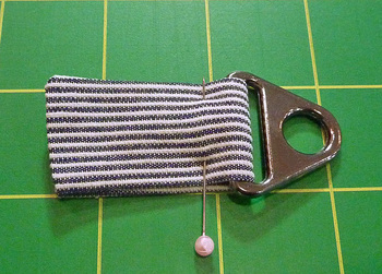 - The raw end of the webbing should be pulled through 1”, which means the bottom of the ring should now sit right at the 10½” point. Pin the pulled-through end in place.
