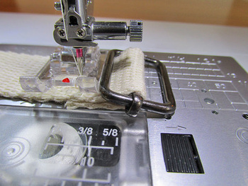 - Loop one end of the webbing through the center bar of the Adjustable Slide Buckle. Pull it all the way through and back on itself about 1″. Stitch in place to secure. We used a dense zig zag stitch, running across and back several times for a nice, tight seam.