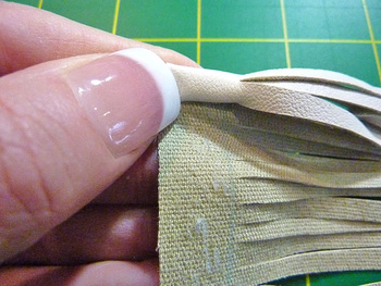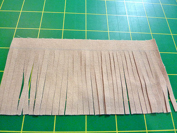 - Using this guide line as your stop point, cut fringe all the way across, slicing even centimeters (that’s about 3/16” wide slices, US folks).