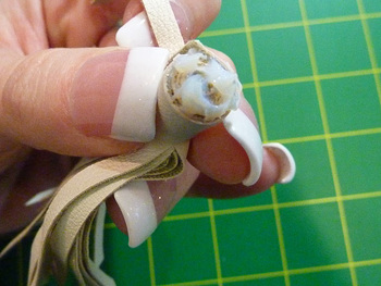 - Tightly roll up the tassel. It’s easier to roll it tight and then let it release a bit to fit if need be. The opening of the Dritz Tassel Cap is about ⅝” in diameter.